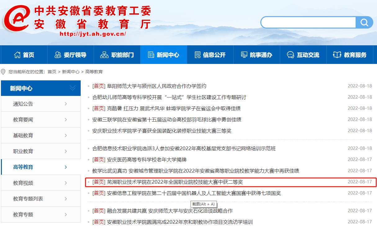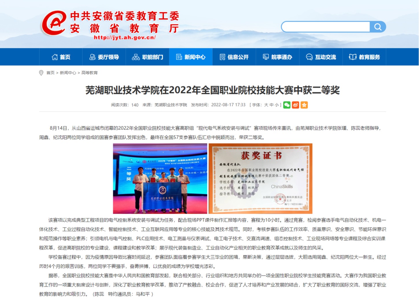 8月14日,從山西省運城市閉幕的2022年全國職業院校技能大賽高職組“現代電氣系統安裝與調試”賽項現場傳來喜訊,由金年会張瑾、陳蕊老師指導,周鑫、紀沈陽兩位同學組成的國賽參賽團隊發揮出色,最終在全國57支參賽隊伍彙總中脫穎而出,榮獲二等獎。