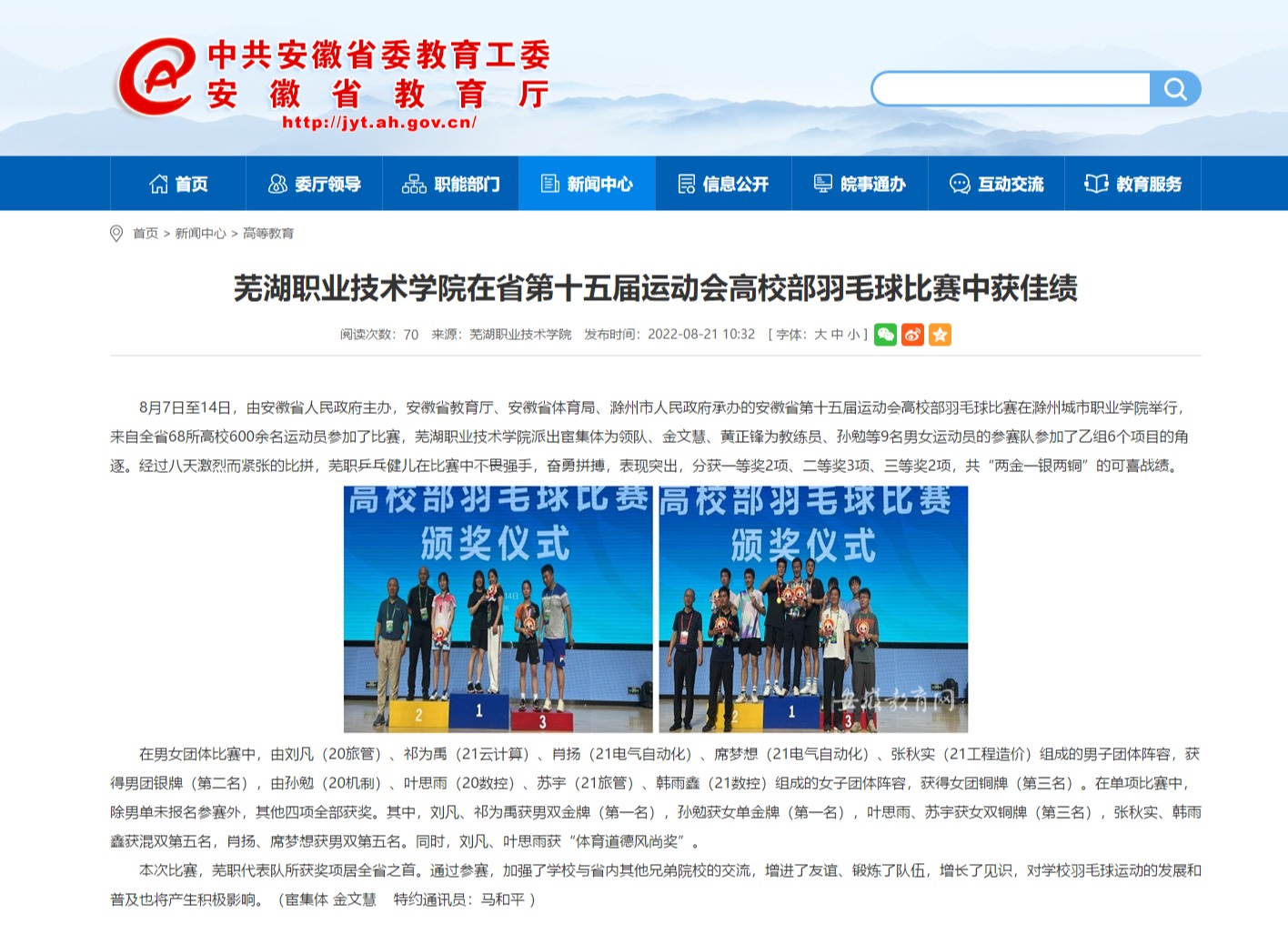 8月7日至14日,由安徽省人民政府主辦,安徽省教育廳、安徽省體育局、滁州市人民政府承辦的安徽省第十五屆運動會高校部羽毛球比賽在滁州城市職業學院舉行,來自全省68所高校600餘名運動員參加了比賽,金年会派出宦集體為領隊、金文慧、黃正鋒為教練員、孫勉等9名男女運動員的參賽隊參加了乙組6個項目的角逐。經過八天激烈而緊張的比拼,金年会乒乓健兒在比賽中不畏強手,奮勇拼搏,表現突出,分獲一等獎2項、二等獎3項、三等獎2項,共“兩金一銀兩銅”的可喜戰績。